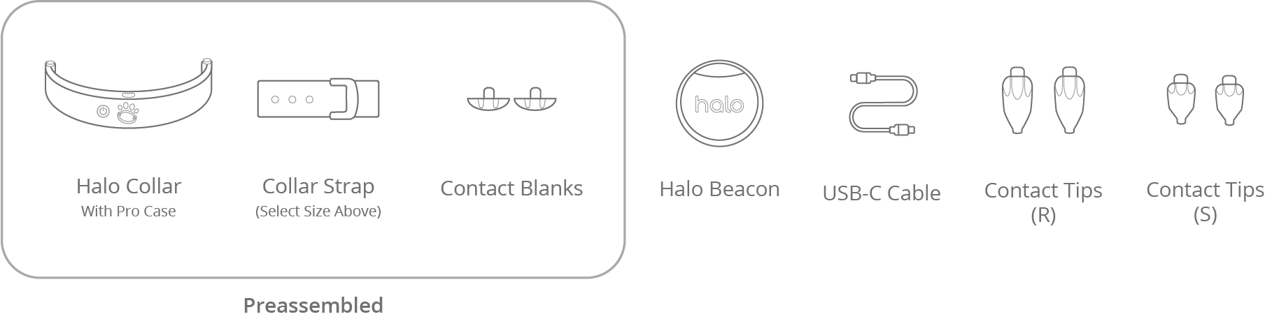 Halo Collar (One Size), Halo Collar Strap (Select Size above), Halo Beacon, USB-C Charging Cable, 3 Pairs of Halo Collar Attachments (Contact Tips (R), Contact Tips (S), Contact Blanks)